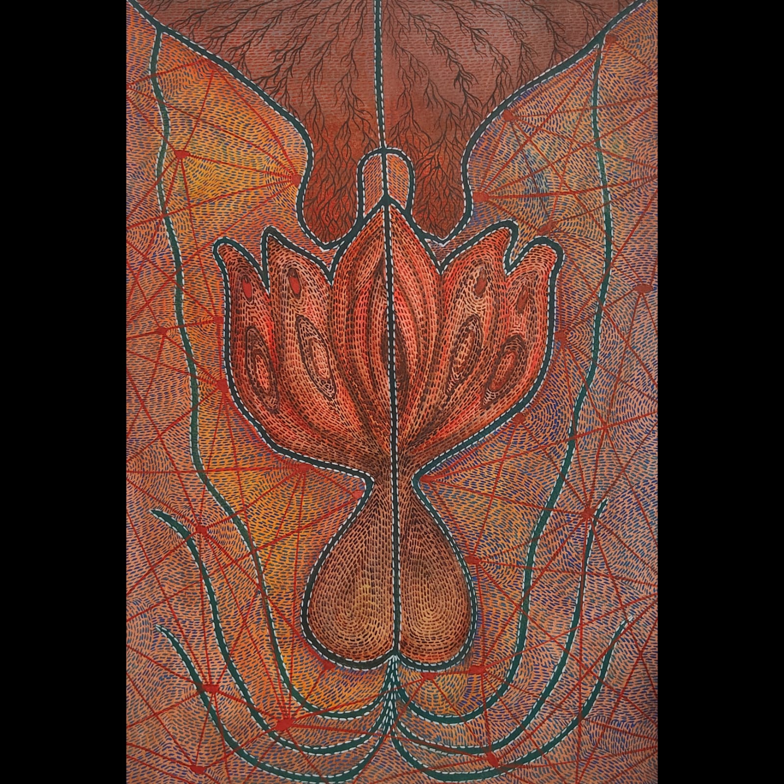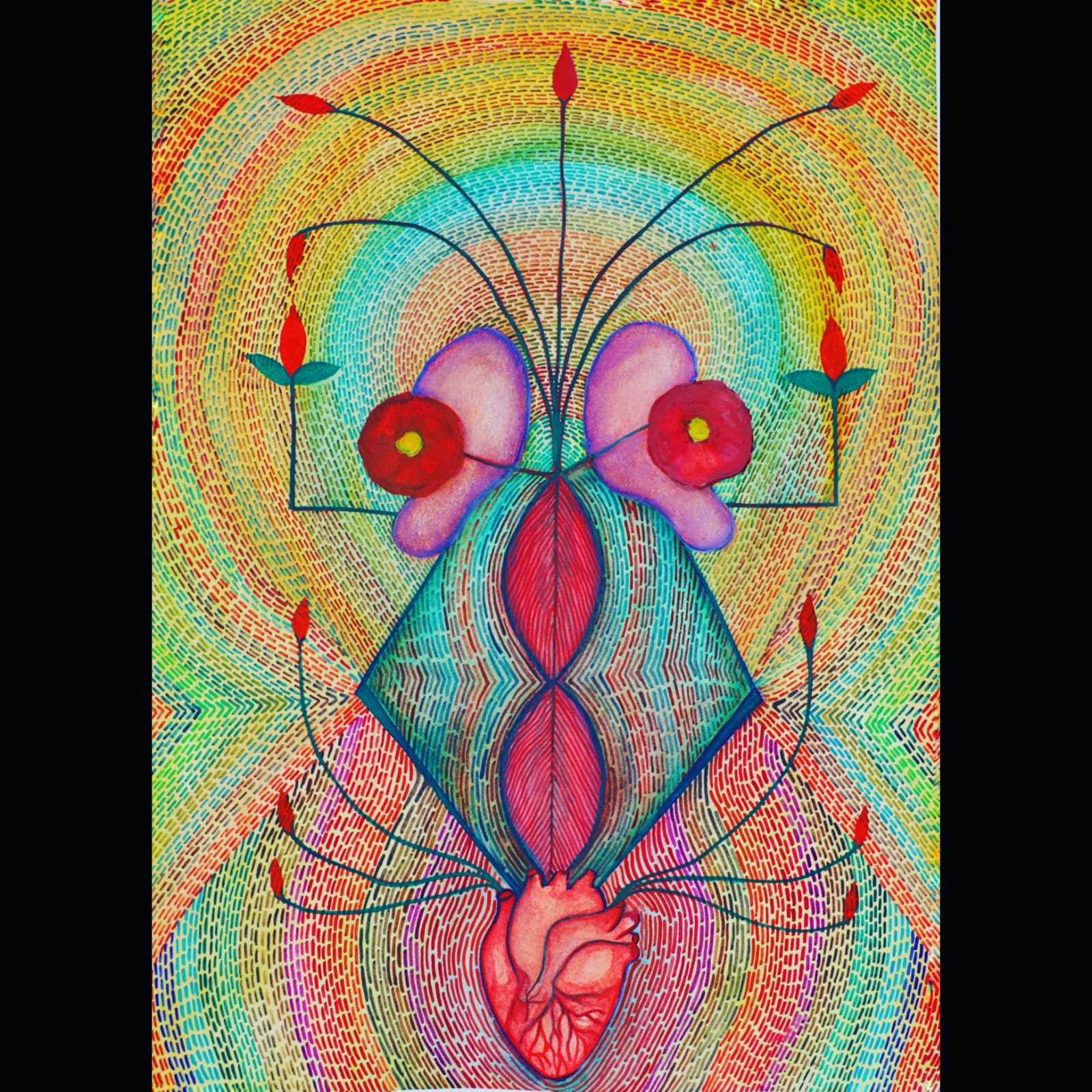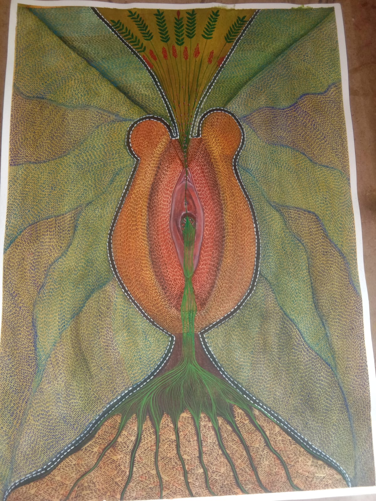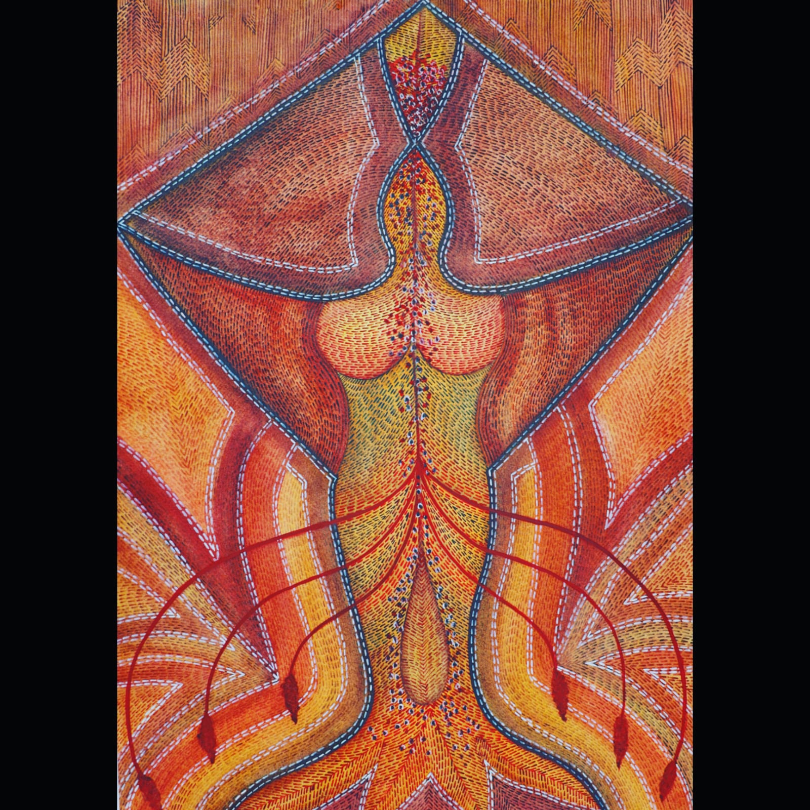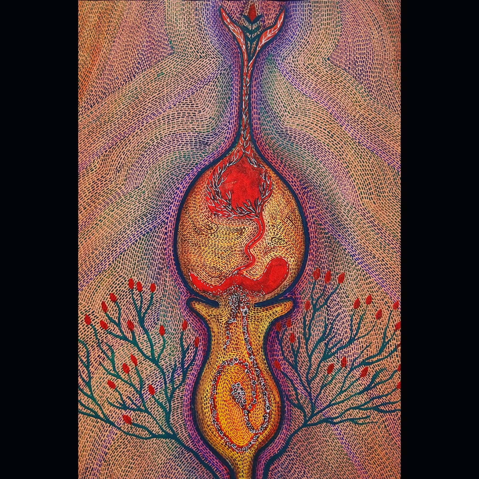 Through my artwork, I aim to celebrate the cyclical nature of life, the sacred bond between male and female, and the transformative power of the female body. I draw inspiration from the historical depictions of fertility goddesses, as well as the beauty and complexity of the human body., tantric diagrams,ore-modern paintings,abstraction, manuscript illuminations, yantra diagrams.
